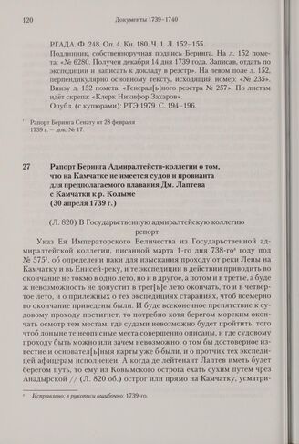 Рапорт Беринга Адмиралтейств-коллегии о том, что на Камчатке не имеется судов и провианта для предполагаемого плавания Дм. Лаптева с Камчатки к р. Колыме. 30 апреля 1739 г.
