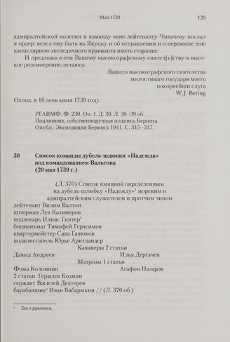 Список команды дубель-шлюпки «Надежда» под командованием Вальтона. 20 мая 1739 г. // РГАВМФ. Ф. 216. Оп. 1. Д. 35. Л. 370-370 об.