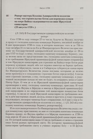 Рапорт мастера Козлова Адмиралтейств-коллегии о том, что строительство ботов для перевозки купцов на озере Байкал задерживается по вине Иркутской канцелярии. 23 августа 1739 г.