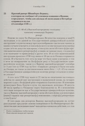 Краткий рапорт Шпанберга Берингу, в котором он сообщает об успешном плавании в Японию и предлагает, чтобы для доклада об экспедиции в Петербург отправился он сам. 3 сентября 1739 г. // РГАВМФ. Ф. 216. Оп. 1. Д. 98. Л. 46 об.-47 об.