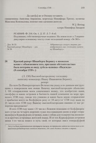 Краткий рапорт Шпанберга Берингу о японском вояже с объяснением того, при каких обстоятельствах была потеряна из виду дубель-шлюпка «Надежда». 8 сентября 1739 г.