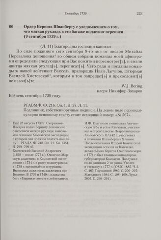 Ордер Беринга Шпанбергу с уведомлением о том, что мягкая рухлядь в его багаже подлежит переписи. 9 сентября 1739 г. // РГАВМФ. Ф. 216. Оп. 1. Д. 37. Л. 11.