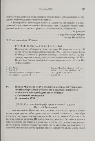 Письмо Чирикова Н.Ф. Головину, в котором он утверждает, что Шпанберг ложно обвинил его в задержке японского вояжа, и просит освободить его от участия в Камчатской экспедиции. 11 сентября 1739 г. // РГАВМФ. Ф. 230. Оп. 1. Д. 30. Л. 20-20 об., 23. Экспедиция Беринга, 1941. С. 318-319.