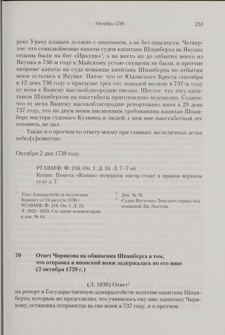 Ответ Чирикова на обвинения Шпанберга в том, что отправка в японский вояж задержалась по его вине. 2 октября 1739 г.