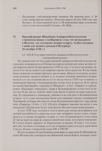 Краткий рапорт Шпанберга Адмиралтейств-коллегии о японском вояже с сообщением о том, что он находится в Якутске, где составляет журнал и карту, чтобы следовать с ними для личного доклада в Петербург. 6 октября 1739 г. // РГАВМФ. Ф. 216. Оп. 1. Д. 44. Л. 152-154.