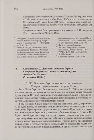 Составленное X. Лаптевым описание берегов Северного Ледовитого океана от ленского устья до мыса Св. Фаддея. 21 октября 1739 г. // РГАВМФ. Ф. 212. Оп. 11. Д. 782. Л. 245-246.