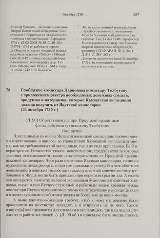 Сообщение комиссара Ларионова комиссару Толбугину с приложением реестра необходимых денежных средств, продуктов и материалов, которые Камчатская экспедиция должна получить от Якутской канцелярии. 24 октября 1739 г.