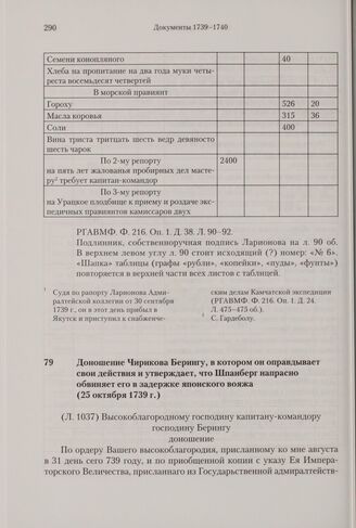 Доношение Чирикова Берингу, в котором он оправдывает свои действия и утверждает, что Шпанберг напрасно обвиняет его в задержке японского вояжа. 25 октября 1739 г. // РГАВМФ. Ф. 216. Оп. 1. Д. 24. Л. 1037-1038.