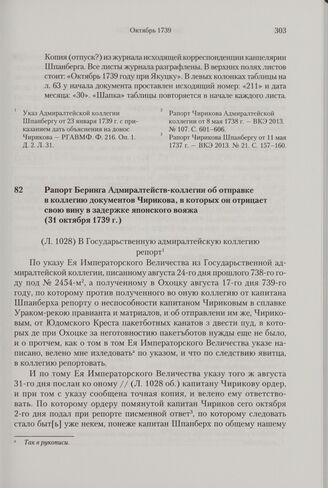 Рапорт Беринга Адмиралтейств-коллегии об отправке в коллегию документов Чирикова, в которых он отрицает свою вину в задержке японского вояжа. 31 октября 1739 г. // РГАВМФ. Ф. 216. Оп. 1. Д. 24. Л. 1028-1029.