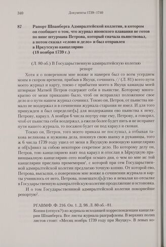 Рапорт Шпанберга Адмиралтейской коллегии, в котором он сообщает о том, что журнал японского плавания не готов по вине штурмана Петрова, который сначала пьянствовал, а потом сказал «слово и дело» и был отправлен в Иркутскую канцелярию. 18 ноября 1739 г. // РГАВМФ. Ф. 216. Оп. 1. Д. 98. Л. 80 об-81. РГАВМФ. Ф. 212. Оп. 11. Д. 774.