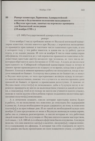 Рапорт комиссара Ларионова Адмиралтейской коллегии о бедственном положении находящихся в Якутске крестьян, занятых на перевозке провианта для Камчатской экспедиции. 18 ноября 1739 г. // РГАВМФ. Ф. 216. Оп. 1. Д. 44. Л. 160-160 об.