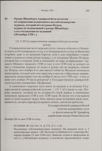Рапорт Шпанберга Адмиралтейств-коллегии об отправлении подписанного им собственноручно журнала, который вел штурман Петров, журнал не подписавший и рапорт Шпанбергу о его составлении не подавший. 20 ноября 1739 г. // РГАВМФ. Ф. 212. Оп. 11. Д. 774. Л. 1-1 об.