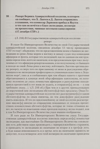 Рапорт Беринга Адмиралтейской коллегии, в котором он сообщает, что X. Лаптев и Д. Лаптев отправились в плавания, что комиссар Ларионов прибыл в Якутск и что сам он печется о благе экспедиции, несмотря на препятствия, чинимые местными канцеляриями. 17 декабря 1739 г. // РГАВМФ. Ф. 216. Оп. 1. Д. 24. Л. 216-220 об.