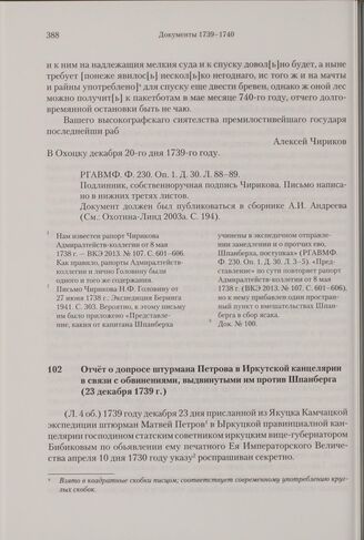 Отчет о допросе штурмана Петрова в Иркутской канцелярии в связи с обвинениями, выдвинутыми им против Шпанберга. 23 декабря 1739 г. // РГАДА. Ф. 248. Оп. 113. Кн. 25. Л. 4 об.-7 об.