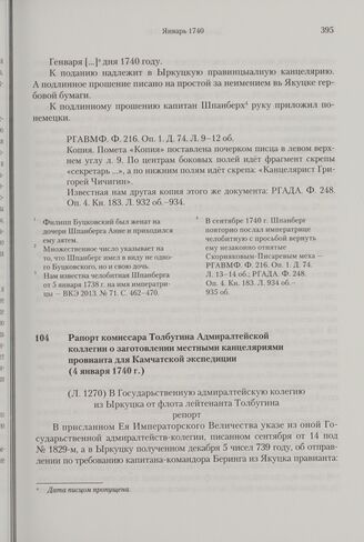 Рапорт комиссара Толбугина Адмиралтейской коллегии о заготовлении местными канцеляриями провианта для Камчатской экспедиции. 4 января 1740 г. // РГАВМФ. Ф. 216. Оп. 1. Д. 24. Л. 1270-1272 об.