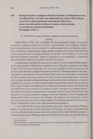 Рапорт Беринга Адмиралтейской коллегии с сообщением о том, что Шпанберг, так как ему приказано не ехать в Петербург, до особого распоряжения находится в Якутске, занят составлением журнала и карты своего вояжа и готовится к новому плаванию. 9 янва...