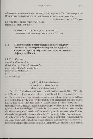 Частное письмо Беринга австрийскому резиденту Гогенгольцу, в котором он заверяет его в дружбе и выражает тревогу об устройстве старших сыновей. 2 февраля 1740 г. // АВПРИ. Ф. 14. Оп. 14/1. Д. 91. Л. 2,3-4 об. Lind, Мøllег, 1997. S. 97- 100; Охотина-Линд, 2004. С. 189-191; Мøllег, Lind ,2008. Р. 92-97.