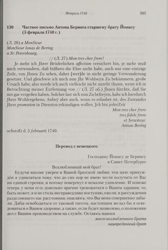 Частное письмо Антона Беринга старшему брату Йонасу. 5 февраля 1740 г. // АВПРИ. Ф. 14. Оп. 14/1. Д. 91. Л. 27,28. Lind, Мøllег, 1997. S. 78; Охотина-Линд, 2004. С. 214-215; Мøllег, Lind, 2008. Р. 72-73.