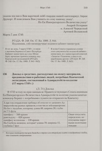 Доклад о средствах, расходуемых на оплату материалов, продовольствия и работных людей, потребных Камчатской экспедиции, составленный в Адмиралтейств-коллегии. 17 марта 1740 г.