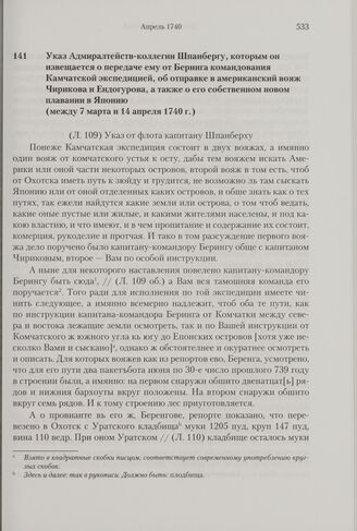 Указ Адмиралтейств-коллегии Шпанбергу, которым он извещается о передаче ему от Беринга командования Камчатской экспедицией, об отправке в американский вояж Чирикова и Ендогурова, а также о его собственном новом плавании в Японию. Между 7 марта и 14 апреля 1740 г. // РГАВМФ. Ф. 216. Оп. 1. Д. 44. Л. 109-119, 120-123 об. Экспедиция Беринга, 1941. С. 260-267; Русские открытия, 1948. С. 97-10; Русские экспедиции, 1984. С. 196-202.