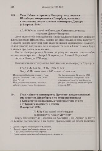 Указ Кабинета сержанту Чичерину, не дожидаясь Шпанберга, возвратиться в Петербург, поскольку к последнему послан с указом каптенармус Друкорт. 14 апреля 1740 г.