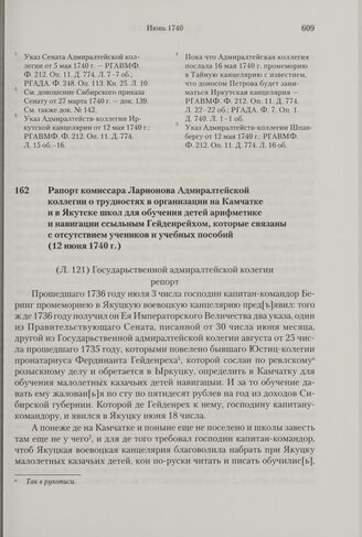 Рапорт комиссара Ларионова Адмиралтейской коллегии о трудностях в организации на Камчатке и в Якутске школ для обучения детей арифметике и навигации ссыльным Гейденрейхом, которые связаны с отсутствием учеников и учебных пособий. 12 июня 1740 г.