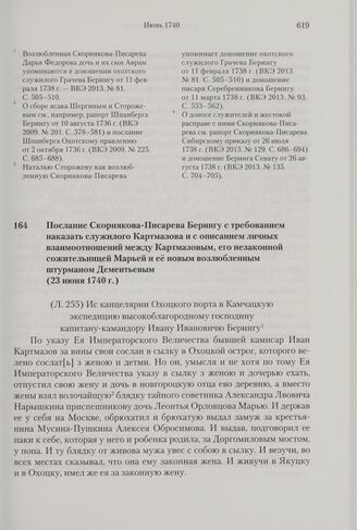 Послание Скорнякова-Писарева Берингу с требованием наказать служилого Картмазова и с описанием личных взаимоотношений между Картмазовым, его незаконной сожительницей Марьей и ее новым возлюбленным штурманом Дементьевым. 23 июня 1740 г. // РГАВМФ. Ф. 216. Оп. 1. Д. 29. Л. 255-256 об. РГАДА. Ф. 248. Оп. 21. Кн. 1361. Л. 875 об.-877 об.