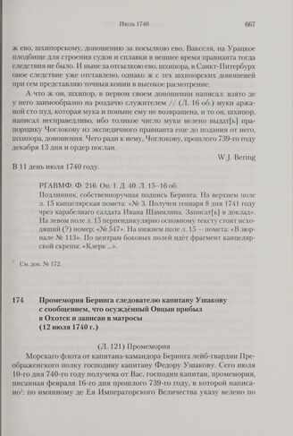 Промемория Беринга следователю капитану Ушакову с сообщением, что осужденный Овцын прибыл в Охотск и записан в матросы. 12 июля 1740 г. // РГАДА. Ф. 6. Оп. 1. Д. 179. Ч. 8. Л. 121.