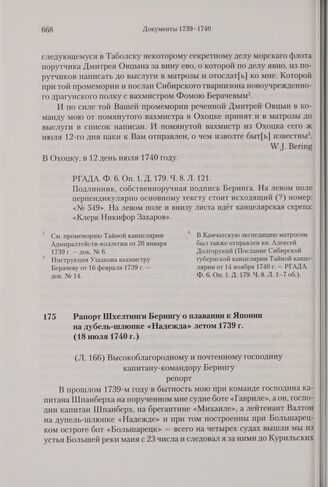 Рапорт Шхелтинги Берингу о плавании к Японии на дубель-шлюпке «Надежда» летом 1739 г. 18 июля 1740 г. // РГАВМФ. Ф. 216. Оп. 1. Д. 43. Л. 166-170 об. Экспедиция Беринга, 1941. С. 234-239; Русские экспедиции, 1984. С. 202-205.