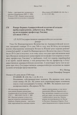 Рапорт Беринга Адмиралтейской коллегии об отсылке пробы корня ревеня, добытого на р. Юдоме, на исследование профессору Гмелину. 21 июля 1740 г.
