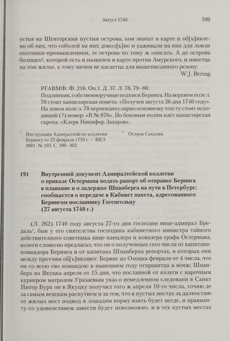 Внутренний документ Адмиралтейской коллегии о приказе Остермана подать рапорт об отправке Беринга в плавание и о задержке Шпанберга на пути в Петербург; сообщается о передаче в Кабинет пакета, адресованного Берингом посланнику Гогенгольцу. 27 авгу...