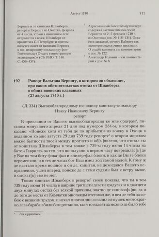 Рапорт Вальтона Берингу, в котором он объясняет, при каких обстоятельствах отстал от Шпанберга в обоих японских плаваньях. 27 августа 1740 г. // РГАВМФ. Ф. 212. Оп. 11. Д. 774. Л. 334-335 об.
