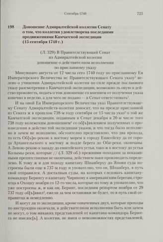 Доношение Адмиралтейской коллегии Сенату о том, что коллегия удовлетворена последними продвижениями Камчатской экспедиции. 15 сентября 1740 г. // РГАДА. Ф. 248. Оп. 21. Кн. 1366. Л. 329-330 об. РГАВМФ. Ф. 212. Оп. 11. Д. 782. Л. 304-305 об.; РГАДА. Ф. 248. Кн. 1327. Л. 110-111 об. Материалы, 1880. С. 706-707.
