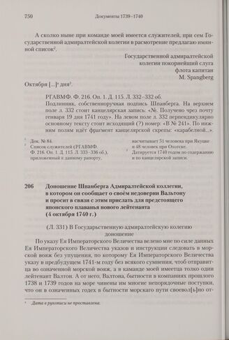 Доношение Шпанберга Адмиралтейской коллегии, в котором он сообщает о своем недоверии Вальтону и просит в связи с этим прислать для предстоящего японского плаванья нового лейтенанта. 4 октября 1740 г. // РГАВМФ. Ф. 216. Оп. 1. Д. 115. Л. 331-331 об.