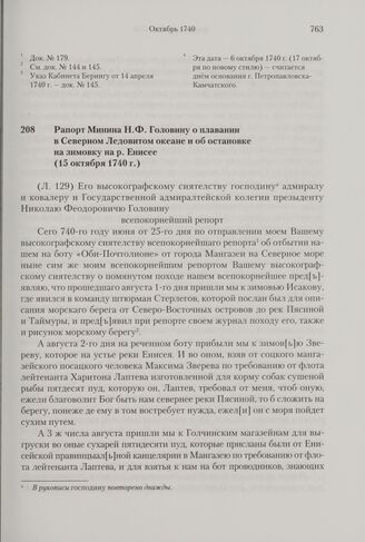 Рапорт Минина Н.Ф. Головину о плавании в Северном Ледовитом океане и об остановке на зимовку на р. Енисее. 15 октября 1740 г. // РГАВМФ. Ф. 230. Оп. 1. Д. 30. Л. 129-135.