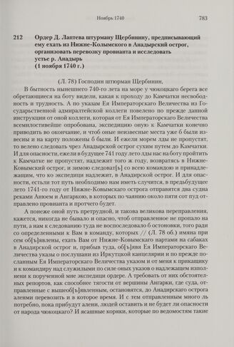 Ордер Д. Лаптева штурману Щербинину, предписывающий ему ехать из Нижне-Колымского в Анадырский острог, организовать перевозку провианта и исследовать устье р. Анадырь. 1 ноября 1740 г. // РГАВМФ. Ф. 216. Оп. 1. Д. 47. Л. 78-81.