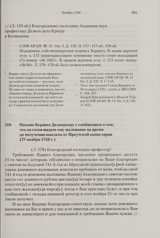 Письмо Беринга Делакроеру с сообщением о том, что он готов выдать ему жалование на время до получения выплаты от Иркутской канцелярии. 27 ноября 1740 г. // СПФ АРАН. Ф. 21. Оп. 5. Д. 133. Л. 179-179 об., 180 об.