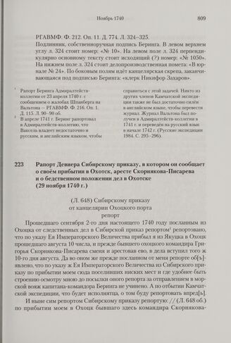 Рапорт Девиера Сибирскому приказу, в котором он сообщает о своем прибытии в Охотск, аресте Скорнякова-Писарева и о бедственном положении дел в Охотске. 29 ноября 1740 г.