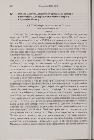 Рапорт Девиера Сибирскому приказу об осмотре нового места для переноса Охотского острога. 5 декабря 1740 г. // РГАВМФ. Ф. 216. Оп. 1. Д. 36. Л. 57-60.