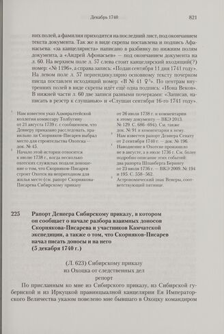 Рапорт Девиера Сибирскому приказу, в котором он сообщает о начале разбора взаимных доносов Скорнякова-Писарева и участников Камчатской экспедиции, а также о том, что Скорняков-Писарев начал писать доносы и на него. 5 декабря 1740 г. // РГАДА. Ф. 248. Оп. 21. Кн. 1361. Л. 623-626.