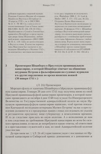 Промемория Шпанберга в Иркутскую провинциальную канцелярию, в которой Шпанберг отвечает на обвинения штурмана Петрова в фальсификации им судовых журналов и в других нарушениях во время японских вояжей. 30 января 1741 г.