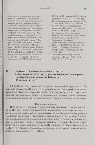 Экстракт о перевозке провианта в Охотск и строительстве для этого судов, составленный офицерами Камчатской экспедиции для Кабинета. 18 апреля 1741 г. // АВПРИ. Ф. РАК. Оп. 888. Д. 1. Л. 148-160. Из истории основания, 1936. Т. 1. С. 150-161.