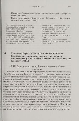 Доношение Беринга Сенату о бедственном положении Камчатки, о необходимости прислать туда хорошего командующего, распространить христианство и завести школы. 25 апреля 1741 г. // РГАДА. Ф. 248. Кн. 796. Л. 41-42.