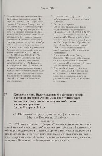 Доношение жены Вальтона, жившей в Якутске с детьми, в котором она по поручению мужа просит Шпанберга выдать ей его жалованье для закупки необходимого в плавании провианта. Около 29 апреля 1741 г.