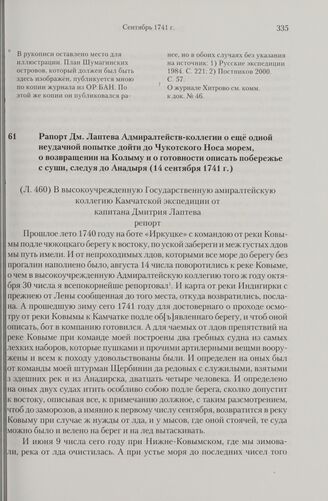 Рапорт Дм. Лаптева Адмиралтейств-коллегии о еще одной неудачной попытке дойти до Чукотского Носа морем, о возвращении на Колыму и о готовности описать побережье с суши, следуя до Анадыря. 14 сентября 1741 г. // РГАВМФ. Ф. 216. Оп. 1. Д. 51. Л. 460-462.