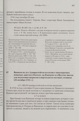 Выписка из дел Адмиралтейств-коллегии о многократных попытках завести в Охотске, на Камчатке и в Якутске школы для подготовки матросов и мореходов из местных учеников. 25 октября 1741 г. // РГАВМФ. Ф. 216. Оп. 1. Д. 51. Л. 130-135.