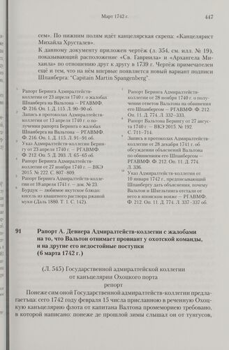 Рапорт А. Девиера Адмиралтейств-коллегии с жалобами на то, что Вальтон отнимает провиант у охотской команды, и на другие его недостойные поступки. 6 марта 1742 г.
