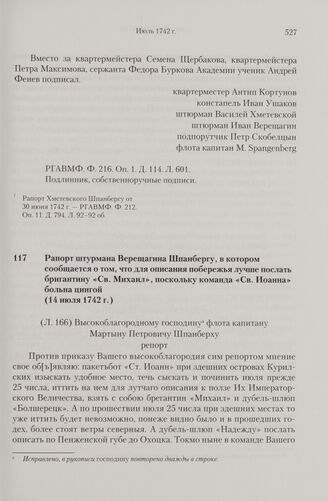 Рапорт штурмана Верещагина Шпанбергу, в котором сообщается о том, что для описания побережья лучше послать бригантину «Св. Михаил», поскольку команда «Св. Иоанна» больна цингой. 14 июля 1742 г. // РГАВМФ. Ф. 216. Оп. 1. Д. 117. Л. 166-166 об.