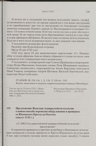 Предложение Вальтона Адмиралтейств-коллегии о новом способе перевозки оборудования и провианта от Юдомского Креста до Охотска. Август 1742 г. // РГАВМФ. Ф. 216. Оп. 1. Д. 117. Л. 286-290 об.
