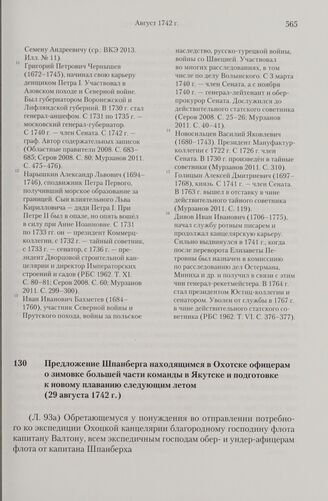 Предложение Шпанберга находящимся в Охотске офицерам о зимовке большей части команды в Якутске и подготовке к новому плаванию следующим летом. 29 августа 1742 г. // РГАВМФ. Ф. 212. Оп. 11. Д. 794. Л. 93а-93б. РГАВМФ. Ф. 216. Оп. 1. Д. 116. Л. 321-322.